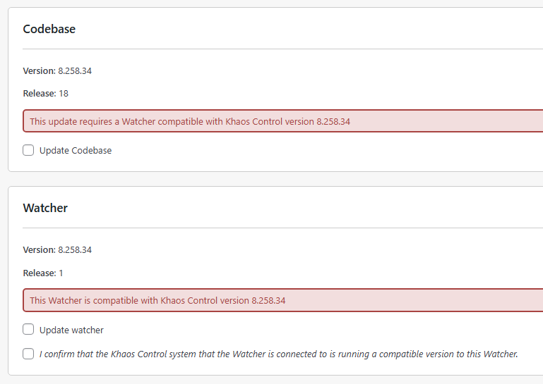 NOTE: It is very important that you only update to a version that is compatible with your current Khaos Control version. Updating to a newer version than that may cause error with the Watcher.